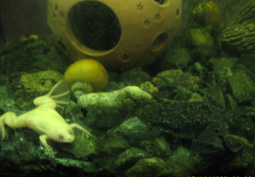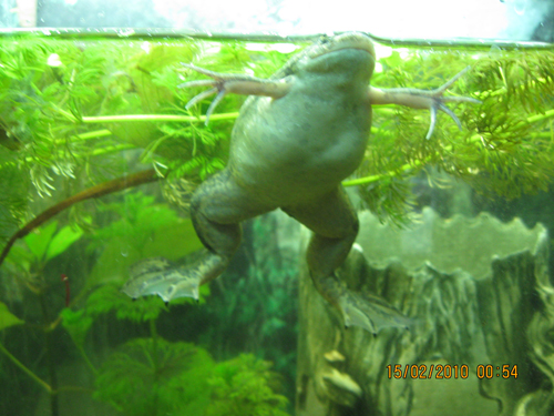 Очень древнее животное, возникшее ещё 160 млн. лет назад. Содержать их очень просто: на одну лягушку должно приходиться не менее 10 л воды, температура может колебаться от 18 до 32 С, но наиболее предпочтительна температура 20-25 С. Воду меняют на 1/5 часть примерно раз в неделю, она должна быть отстояна в течение 1 - 2 суток. В качестве грунта используют гальку, гравий. Растения и аэрация в аквариуме с шпорцевой лягушкой не обязательны, так как она дышит атмосферным воздухом. Кормить лягушек надо около 3-х раз в неделю. Кормить можно и одним мотылем, но лягушки с удовольствием поедают кусочки сырой рыбы или курицы, печень, выдержанных около суток в воде дождевых червей. Во избежание побегов аквариум накрывают сеткой или стеклом. Шпорцевые лягушки очень умны, их можно даже в какой-то мере приручить! Если лягушек регулярно кормить с рук, то вскоре они перестают бояться человека, разрешают к себе прикоснуться. Но доставать их из воды не надо.